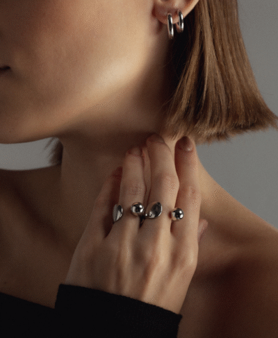 Organic silver hoop earrings with a fluid, sculptural silhouette. Crafted in 925 sterling silver with optional 18K gold plating. Height 24 mm — bold enough…
